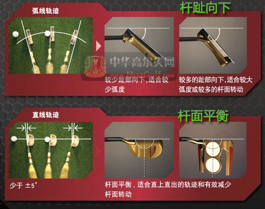 iPING通过测量球手推杆时杆面转动的角度, 把球手的动作分为三类:平摆, 微弧度, 大弧度. 球手可据此去选择相应的球杆平衡类型: 例如杆面平衡型推杆就更适合那些平摆,推杆动作较直的选手. 而推杆动作有弧度的球手就应该选择杆趾向下的球杆. PING的颜色标识系统非常直观,不用考虑上面那些术语,看颜色即可.比如带蓝色标识的球杆(Anser5)适用于推杆较直的球手(杆面有0到3度的转动), 绿标(Anser1,Anser2,Anser3)适用于推杆带微弧度的选手(杆面有3.5到7.5度的转动), 而红标(Anser4,Anser6)适用于推杆带大弧度的球手(杆面转动多余7.5度). 此次不同的平衡类型是通过使用不同的杆颈类型来实现的,但杆头设计还是一致的.