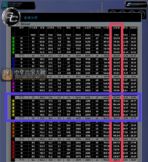 如果哪位看不清的话7铁的5杆距离分别是181,186,176,179,169,平均距离是178。是不是很恐怖?这里要强调7铁的平均挥速是76mph,也并不是很快哦!