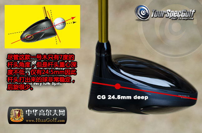 我在试杆之前查看了它的数据,它的重心并不是很低,离杆面有24.5mm,通常大MOI的一号木都有一个比较低的重心,从而能让容错更好一些,并且在一些非甜点击球距离更远一些。这款的重心设计是为了能有更高的起飞角。