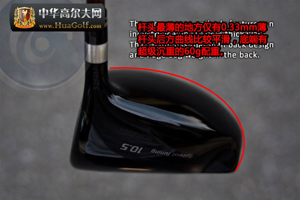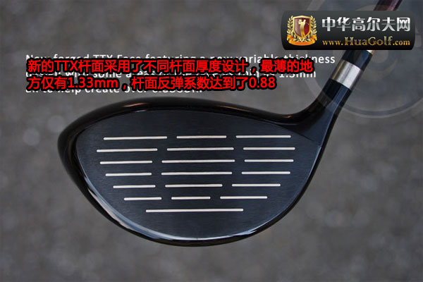 新款的D-1 Special Tuning款式采用了全新的锻造TTX杆面材质,目前的D-1和V-Spec采用的是TDW以及Premia TDX。他们还是用了不同的杆面厚度,从而达到一个弹簧的效果。甜蜜点的杆面厚度有2.6mm,而甜蜜点外面一圈的位置只有1.3mm!杆面用激光镭射切割,杆头其他位置最薄的地方仅有0.3mm的厚度!这一款一号木的设计核心就是为了距离更远,最适合的挥杆速度是105mph以下。