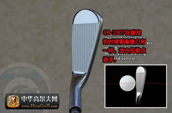 与其他所有类似的CB的款式一样,Miura的顶部也保持得非常薄,杆面后移也非常小。从瞄球的角度看,CB-1007与职业的刀背一模一样。