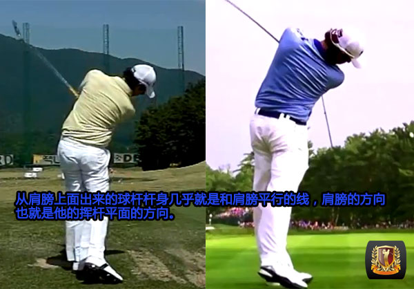 先来说说核心的问题,80%我遇到的业余球手做不到释放充分。这一点如何判断呢?很简单,去看球手打球,你站在球手击球方向的正后方,你看他的收杆。如果杆头从他的肩膀上穿出来以后,杆身的方向跟他的挥杆平面一致(像下图这样)就说明他释放充分了,如果他是像我这样就说明释放不足。释放不足,本质上就是右手没有完全超过左手,咱们一般说的“手腕比较紧,不够放松”,以及“撩球”,还有最臭名昭著的“鸡翅膀”就是释放不充分的结果。要达到释放充分,左胳膊肘首先要夹紧身体,要“胳膊肘往里拐”,第二手腕要积极翻转,以前我们华高店有个练习用具,就是像一块手表一样的东西,左右手都戴上,表盘戴在手腕内侧,在击完球一瞬间让这两块表盘碰上。你能做到这一点,你的杆头就释放充分了。