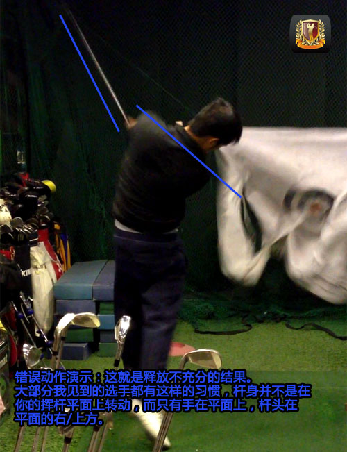 因为你的释放不够快。你如果用你自己的动作,像职业选手那样那么晚释放,你的杆头可能才关闭了一半都不到,打出去球就是大右曲。你想要很晚释放,又需要在击球点的时候把杆面回正,你怎么办?你只能在很短的时间内把杆推下来,用很大力,速度很快地推下来,才能做到。没错,不是说延迟释放是多么反常理,不是那么难,职业才能做到,只不过是你的手腕不习惯这么快这么速度地释放球杆。而且要做到延迟释放还有一个简单的办法,就是把转肩速度放慢。你正常的动作做不到延迟释放,就是因为你的手臂移动速度太快了,从开始释放到击球可能只有0.03秒,那么手腕做不到在这么短的时间内释放球杆到杆面正直,但是假如你的这个时间放宽到0.09秒,你可能就有足够的时间把杆头释放过去,就能够做到了延迟释放。