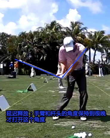 延迟释放。很多人用照相机录像机拍自己的动作,觉得这里这里都完美,就是延迟释放的动作比起职业选手有点差。什么是延迟释放?就是这个释放的动作,在下杆过程当中一直hold住不释放,直到两只手接近击球的位置才开始释放,大家看所有的职业选手都是这么干的。为什么你做不到??