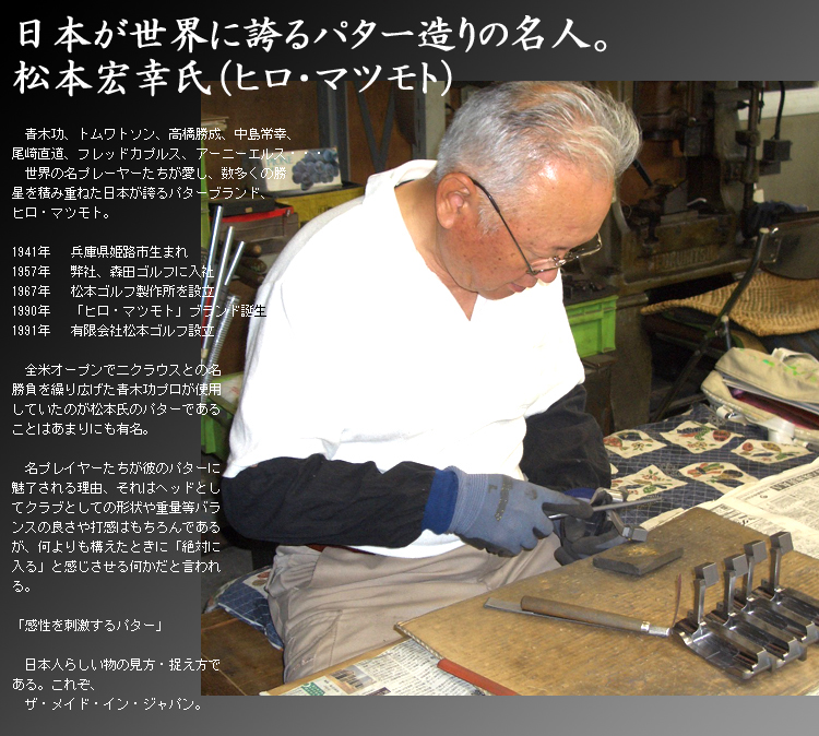 松本宏幸(Hiro Matsumoto),出生于日本中部的库县的姬路市。16岁当学徒做推杆,1957年投身高尔夫行业,开始手工锻造软铁推杆。从进工厂的第一天起,他就潜心于手工技巧及高尔夫推杆。
