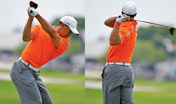 在老虎年轻的时候,他在上杆顶点的时候他的杆面总是有一些扣–就是说他的杆面比起他的手臂的平面来说更接近水平(Jason注释:看下面的左图,这样的原因是因为他的手背几乎和手臂是一条线平行,没有过多的手腕向上翻转,这也是我在修改的众多动作之一!)。这个动作的好处是下杆回正杆面的时候需要较少的手腕翻转动作来把杆面翻正,更容易回正。同时,这样的手背和手臂的动作也正是你在击球一瞬间应该有的动作(Jason又注释:如果手背和手臂夹角过大,击球的时候手的位置就容易滞后于球,导致球弹道过高和不稳定)。许多业余选手的手腕在上杆定点的时候弯折过多(这样也会导致杆头从你的左侧往下坠,很多人控制不了上杆幅度的主要原因之一),这样在你下杆的时候要回正手背就还要多一个下压手腕的动作来弥补。老虎的上杆动作在这几年有过调整,但是他现在又回归了手背伸直的位置,因此他的一号木也又回复了稳定。