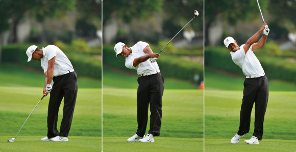 老虎在切杆的时候像推杆一样仔细阅读果岭。他曾经有一阵将握把向前过多保持手腕不动,这样的缺陷就是让杆面的有效角度减小很多,如果你不能完美接触球,这样打厚的几率会很大。