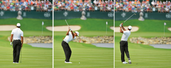 老虎现在试图在击球的时候杆身回到瞄球的位置,他将身体转动向左,击球以后杆头仍然保持比较低的运动轨迹(而不是扬起来),与去年的时候不同,那时他在击球完后杆身仍然是向前倾斜的。