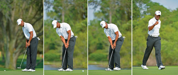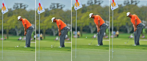 老虎以往的推杆主要靠右手,他经常使用右手单手练习推杆,在上面图片里的第一张,老虎试图去用左手单手练习推杆的摆动,史翠克的推杆动作基本上是用左手将球刷过草地,像用画笔刷油画一样。