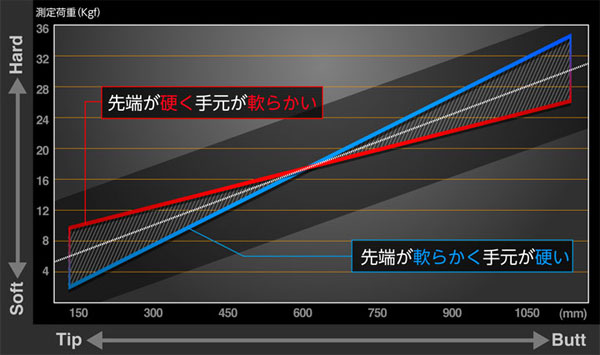 不同的曲线分布究竟有什么差别呢?我们一般说的tip端,也叫前端,也就是杆头端,如果越软,那么杆头Kick的感觉就更强烈,相对来说弹道会更高,如果你的挥杆速度不够快,他会为你加速,并且提供比较长时间的加速时间,让你比较容易在加速的期间击到球。相对来说前端越硬,那么Kick就当然没有那么大,同时杆头摆动的幅度小,重复动作的时候稳定性会更高,弹道会相对来说降低。而握把端越软,手感越舒服,减震效果更好,杆头回馈就少,而越硬就杆头回馈更强,力量传导更完整。