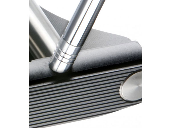杆头上最最明显的,也就是他们的看家本领:2-Bar了,两道棍子。这两个棍子主要起到瞄准和稳定杆头的作用,增加杆头的MOI转动惯量,让你更不容易转动杆头,尤其是在接触球的时候。这两根棍子的重量都集中在尾端,让杆头的重心不断拉后,分散重心的位置,达到稳定的目的。如果你看到Taylormade Spider或者Scotty Cameron新推出的大头推杆Futura X你会发现他们都在尾端增加重量来增加稳定性。