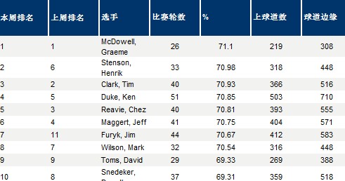 开球上球道率,麦克道威尔稳坐第一,这是真正可怕的一个稳定型选手,71%的上球道率,几乎就是他开球你就看不见什么失误了。斯内德克也是非常稳定的选手,开球都非常靠谱。