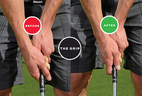 迈克尔的握杆与广大球友一样——都是长期看到球飞路线而逐渐改变的。由于他之前的Slice,因此他的右手逐渐变得更加强势来让杆头更容一扣过来。在我们改变了他的挥杆平面以后,我将他的右手变得更加中性来配合他的左手。并且我让他的右手食指变得更像一个扣手枪扳机一样的位置,并且将拇指和食指之间的间距变小。这些变动让他有更强的杆头的控制能力,并且挥杆的幅度也可以变小。
