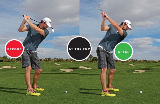 如果你像菲尔普斯一样强壮,你可能会有相同的问题,他的上杆又长又随意,杆头指向目标的右侧,我们改变了他的挥杆平面让他的杆头指向正一些,并且让他的手臂挥杆幅度与他的身体转动配合起来,这样他能有一个稳定的上杆。更短,更快,更激进。他现在有一个7字头选手的挥杆了。