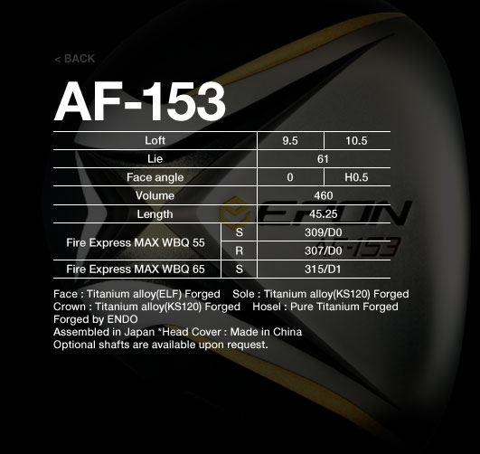 这款一号木总容积460cc,重量大约在193.5克左右,推荐安装长度在45.25寸,使用Fire Express MAX WBQ 55和65两种重量的杆身,挥重/重量设置在D0/309克,到最重的D1/315克。杆面有9.5度和10.5度两种角度,杆面使用的ELF钛铝金属锻造,底部和顶部是KS120钛铝金属锻造,杆颈则是纯钛金属锻造,当然,全部锻造工艺都由ENDO负责。