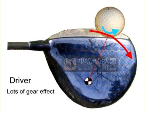 见下图:如果你在偏向杆头趾部的位置击球,从上面看下去,杆头会倾向于顺时针旋转,这是一个很短的瞬间,杆头还在向前进,杆头和球咬在一起,由于高尔夫球材质的缘故,和杆面的摩擦力很大,这个时候的杆面旋转会给球加上一个逆时针的旋转力,球和杆面咬在一起就像齿轮一样,因此这个效果就被称之为齿轮效应。