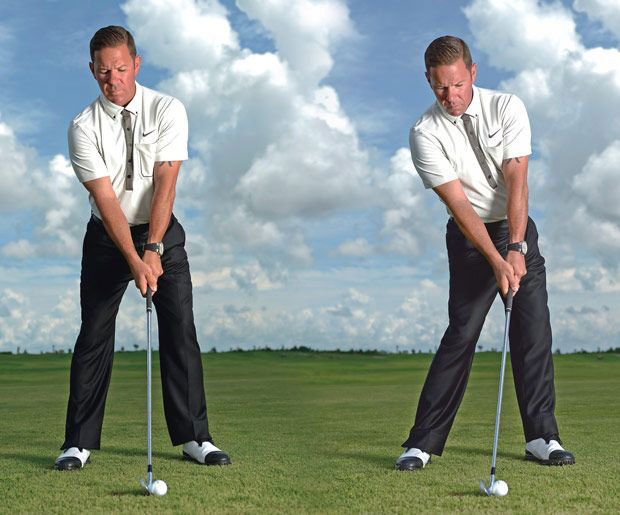 一些简单的调整能帮助你更好的做到这一点。首先,瞄准的时候把你的肩膀多斜一些向后,也就是说你的右肩膀要比你的左肩膀低一些。同时,你的左脚要多大开一些角度,这样会帮助你在击球的过程中更好的转身。