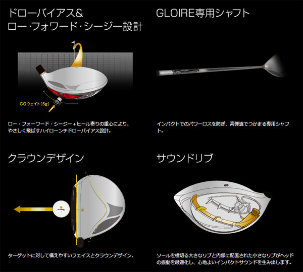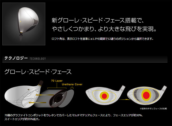作为高尔夫行业中,一号木这个项目毫无争议的NO1,Taylormade自己的旗舰款的一号木当然必须是顶级中的顶级。Gloire的杆面是一块单独的材料,这块杆面由70层碳钢复合材料叠加而成,比普通的杆面甜蜜点面积要大55%。杆顶部不再是Taylormade标志性的白色而是改成了银灰色和黑色的顶面。瞄球的位置有一颗小小的狮子。杆头也是采用可调节杆颈,可以将Loft在正负1.5度内调整。杆头后部根部(靠近杆身的方向)加了一个5克的配重块用于增加左旋的趋势,让球更远。