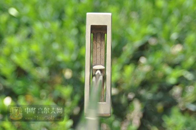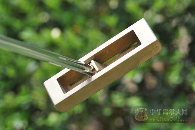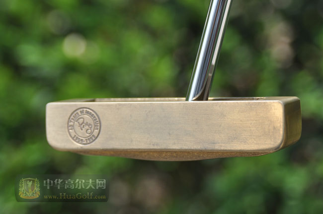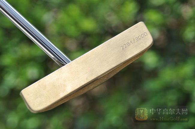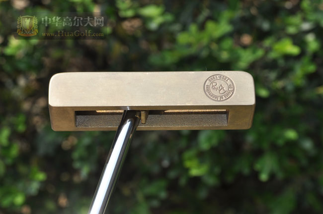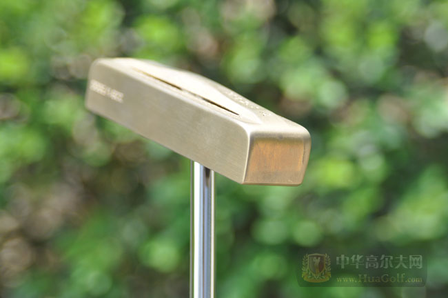这绝对是一支独特的推杆。首先,你绝对见不到另外一支一模一样的款式。这个设计是如此的简单,你会觉得它就是40年前的版本。这支推杆底下是一个左右对称的长方形座,杆身插到杆头中间,因此不管是左撇子还是正手球员,都可以用。当然这种杆就不可能有任何杆面后移,而是杆面前移(OnSet)。如果你觉得用杆头前面顶球也很舒服的话,这支杆更加顺手。整个杆头铜色处理,以前最早这款杆真的是全铜制造,但后来据说由于污染过大,最后还是改为镀铜了。杆面是完全光面平滑的,没有任何纹路,一面的杆趾上有40周年纪念版的字样,另一边有编号,一共制作了3000支。