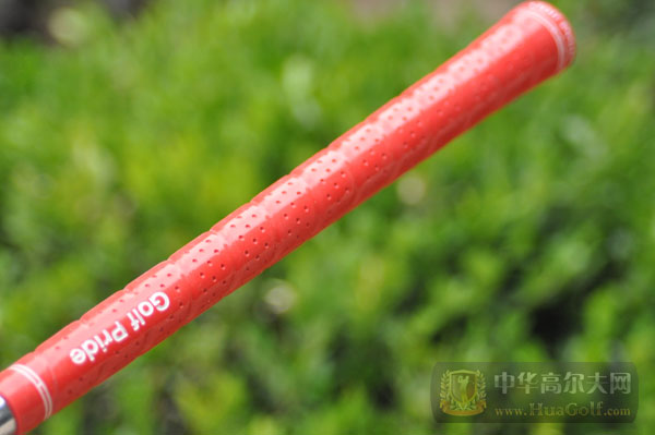 杆身安装的GS85,比较轻的钢杆身,7铁的挥重是D1.5,总重为410.99,挥起来非常轻松,加上它相对比较强势的角度,距离完全不是问题。握把刚好还安了我喜欢的Golf Pride Tour Wrap缠绕式红色握把。这款握把手感柔和非常舒服,但有水的时候会稍滑,在天气正常的情况下手很容易放松,效果非常好。