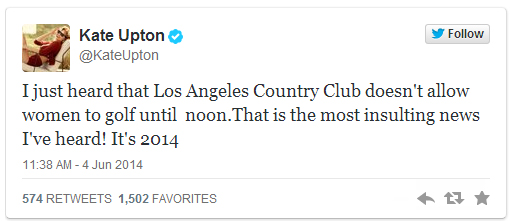超级名模很少在高尔夫的新闻里出现,不过Kate Upton在几个月前刚刚登上高尔夫大师的杂志封面(和高球皇帝帕尔默站在一起)。前两天她发了一条微博说:“洛杉矶乡村俱乐部居然在中午之前不允许女士下场,现在已经是2014年了居然还有这种事!”维护女权我们可以理解,不过可惜的是她的消息十分不准确,很快球场负责人就出来澄清说根本没有这么一回事,同时跟在她的微博底下也有人回复说“Kate你好,我就是乡村俱乐部的女会员,我可以在任何时间下场。有机会我们可以一起打球!”所以Kate Upton就稍稍囧了一下。俗话说胸大无脑可能还真的是很正常吧。