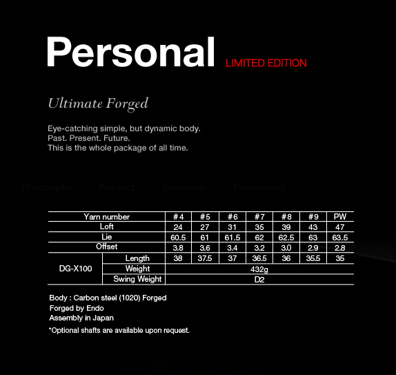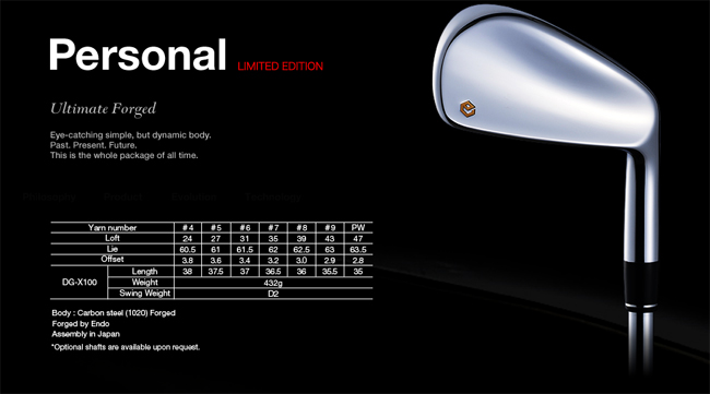 两年前的Epon Personal要出新款了!上一代的Personal是一套人见人爱的铁杆组,背后有明显的叠加型肌肉线条,像花儿一样美丽,而今年的新款Personal则走向了简洁的极致!整个杆头除了一小块Epon的标志以外什么都没有!没有任何棱角,整个就是一个柔和性感的曲线!杆头采用1020碳钢锻造,当然是远藤制作,从4#到P杆。这套角度很传统,7铁是35度的,这个角度赶得上很多新款铁杆的8铁了,如果不打算掰角度的话这套杆其实也可以当短一号杆来使用。和上一套Epon personal一样,这套也是属于低差点的刀背杆,官方数据搭配DG的X100,7铁做35.5的话挥重在D2这样。很期待今年的限量版啊。
