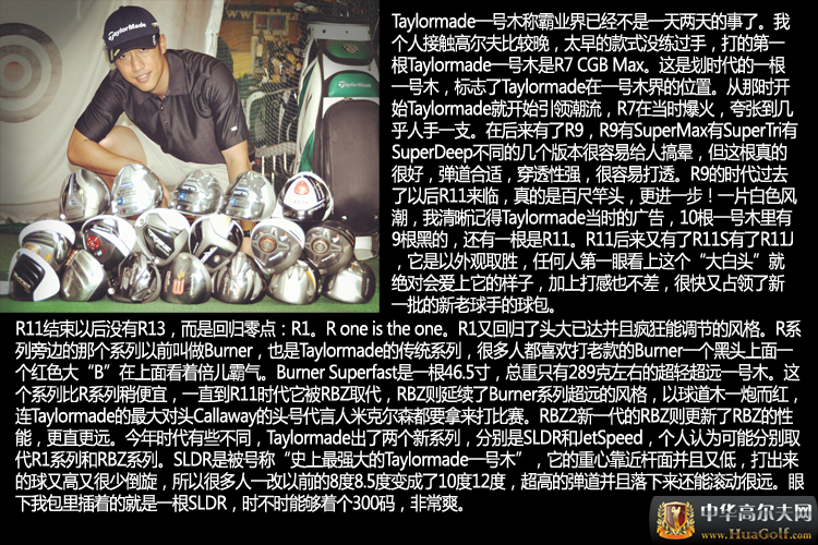R11结束以后没有R13,而是回归零点:R1。R one is the one。R1又回归了头大已达并且疯狂能调节的风格。R系列旁边的那个系列以前叫做Burner,也是Taylormade的传统系列,很多人都喜欢打老款的Burner一个黑头上面一个红色大“B”在上面看着倍儿霸气。Burner Superfast是一根46.5寸,总重只有289克左右的超轻超远一号木。这个系列比R系列稍便宜,一直到R11时代它被RBZ取代,RBZ则延续了Burner系列超远的风格,以球道木一炮而红,连Taylormade的最大对头Callaway的头号代言人米克尔森都要拿来打比赛。RBZ2新一代的RBZ则更新了RBZ的性能,更直更远。今年时代有些不同,Taylormade出了两个新系列,分别是SLDR和JetSpeed,个人认为可能分别取代R1系列和RBZ系列。SLDR是被号称“史上最强大的Taylormade一号木”,它的重心靠近杆面并且又低,打出来的球又高又很少倒旋,所以很多人一改以前的8度8.5度变成了10度12度,超高的弹道并且落下来还能滚动很远。眼下我包里插着的就是一根SLDR,时不时能够着个300码,非常爽。