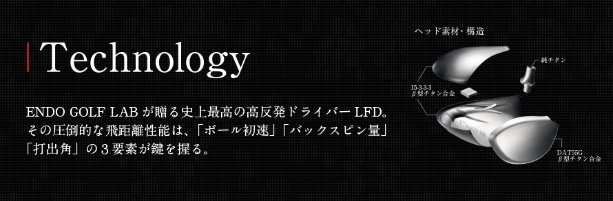 Endo Golf Lab的第一款系列叫做LFD,LFD的特点是高反弹系数(超标)杆头,达到最大化的超远距离。杆头是5片结构的锻造构造。LFD通过三个最基本的点来全面提高距离,最大化球速,最合适的倒旋和最合适的起飞角。远藤第一次使用DAT55 Beta钛金属杆面搭配15-3-3-3 Beta钛金属顶部来制作一号木。杆头的5块使用等离子焊接在一起。