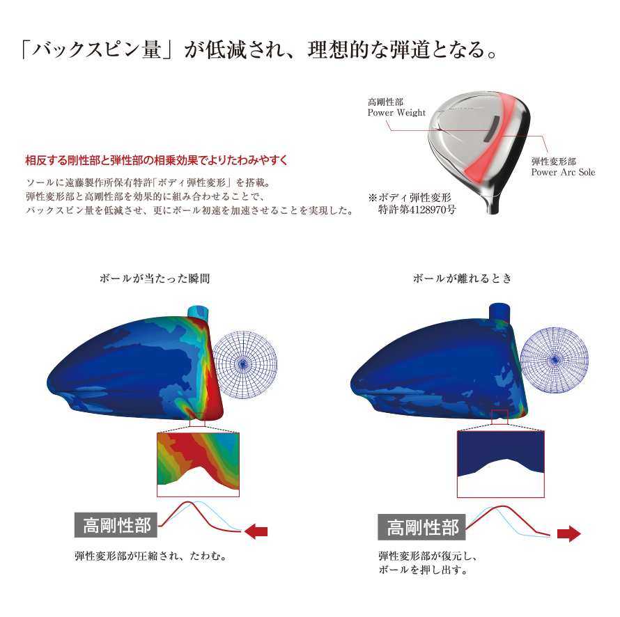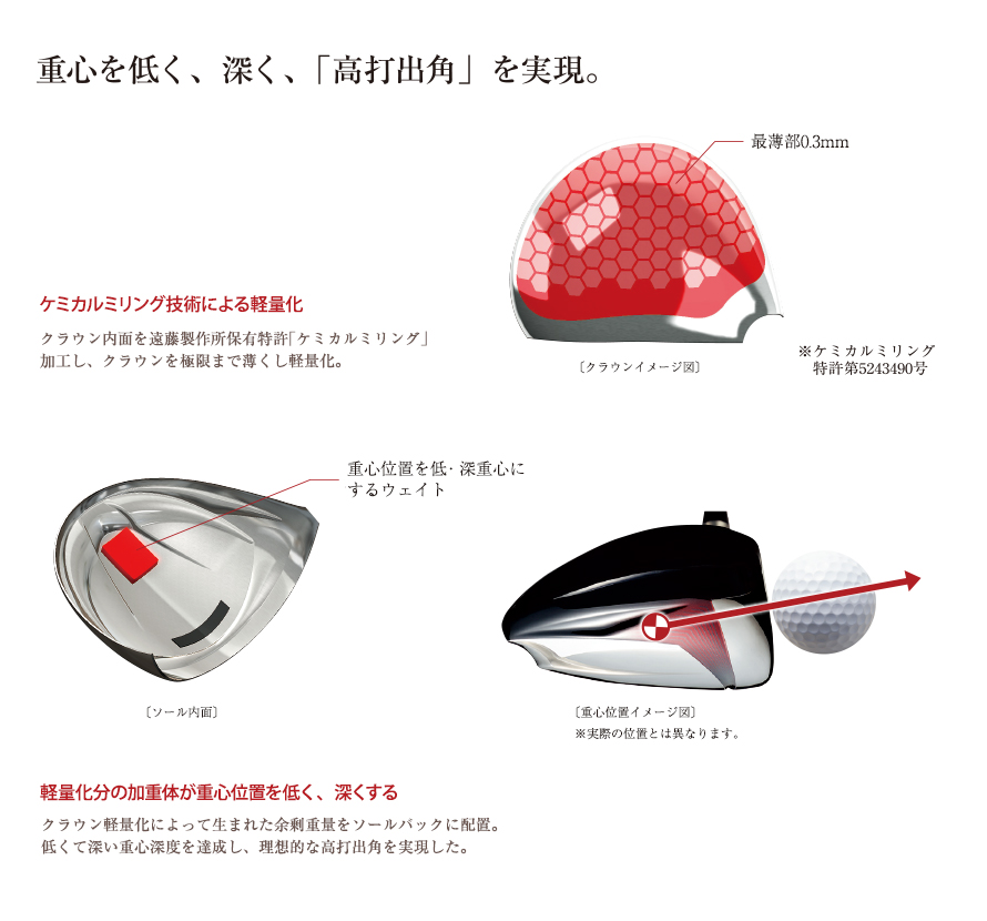 为了增加控制和提供良好的倒旋,远藤专门设计了一种特殊的杆头底部凹槽,没错,这玩意跟Adams和Taylormade和Nike和Titleist的底部加速槽基本是一个意思,但是远藤对其进行了一系列改进,将其扩展到更大,从根部到趾部,来提高甜蜜点的面积,并且减小非甜蜜点击球的距离损失,杆头后部还有一个配重来平衡倒旋和起飞角。