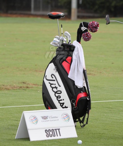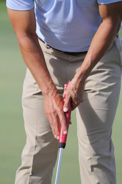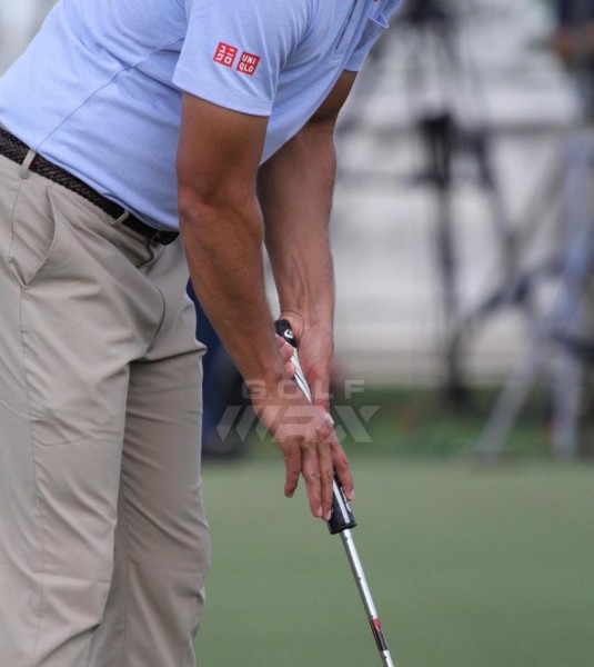 在凯迪拉克锦标赛上亚当斯科特在试验使用不同长度的推杆。从照片上看他在使用“鹰爪”式握杆的一种,与他的长推杆握法比较相近。