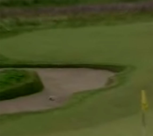他的下一杆攻果岭又有偏差打到了果岭边的沙坑。