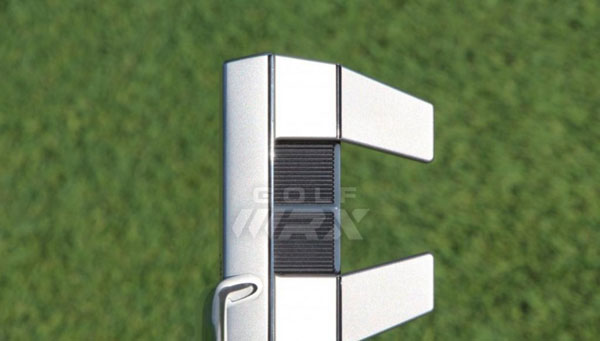各个品牌的不同推杆都有这样那样的瞄准系统,这款Futura推杆也同样充斥着各种瞄准方式。杆头有两条平行杆面的平行黑线,加上两条“尾翼”,很多人会主要参考杆面后方的黑色部分,在这部分对比鲜明的黑色色块上也同样放了一个银色的“T”字型帮助你进一步瞄准。嗯可以说,几乎没有更多方式帮你增加瞄准线了。
