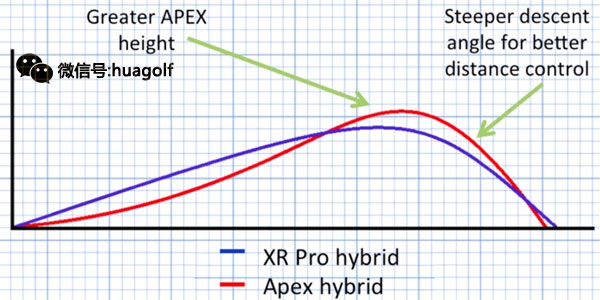 从下图的弹道比较能看出来,Apex铁木杆代表红线,蓝线则是XR Pro铁木杆。比起XR Pro来说,Apex的爬升更厉害,初始角度更低,最高高度更高,下降角度更陡直。