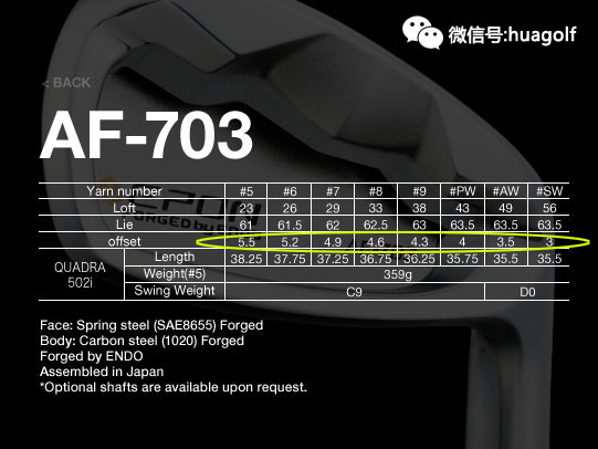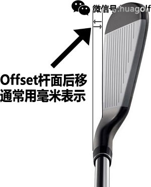 上面这张图就是所谓的offset,也就是最常说的杆面后移程度。这个值越大,说面杆面越往后移,因此稍微研究过点球杆的朋友都会明白,越短的铁杆,杆面后移越小,因此在一套铁杆里面,offset是越来越小的。