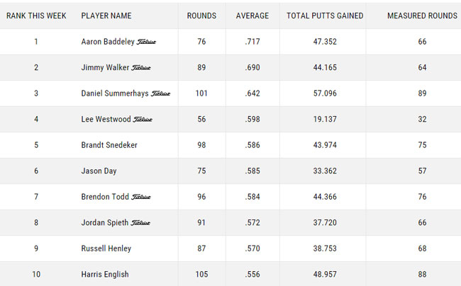另外估计有朋友会好奇这个推杆排名是怎么来的,这是PGA的一种独特算法根据平均杆数平均距离算出的一种独特数据,具体是比较复杂的就不讨论了,基本可以反映一个选手的推杆水平,但当然你要说不同比赛压力不同推杆效果不同,像美国公开赛上Dustin的那3尺的一推没推进去你认为他推杆差吗?完全不差(要是差的话能打到美国公开赛冠军组吗?),只是压力太大。因此复杂的推杆水平也需要复杂的算法来鉴别谁的推杆好。顺便附上2015年最好的10位推杆选手排名。
