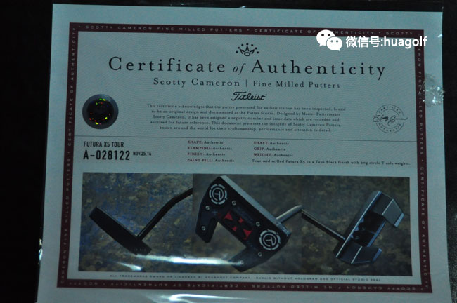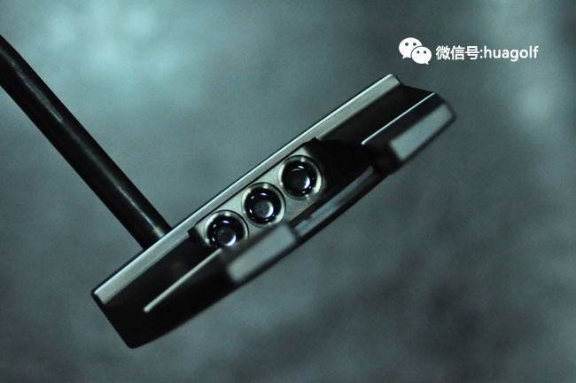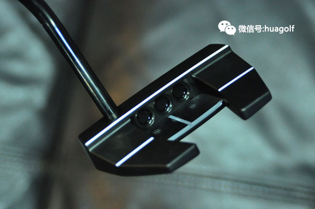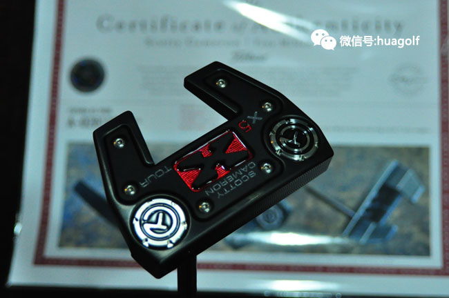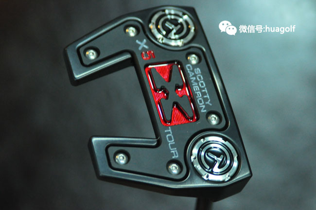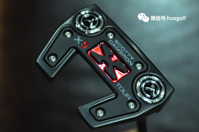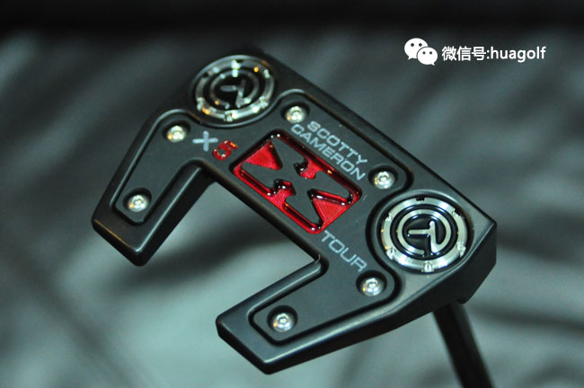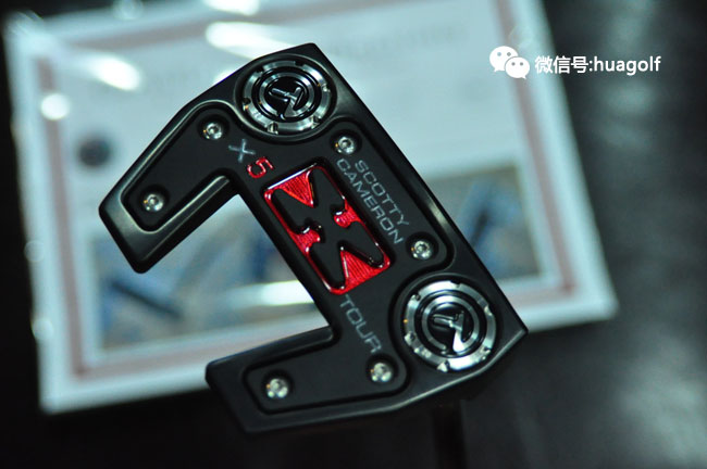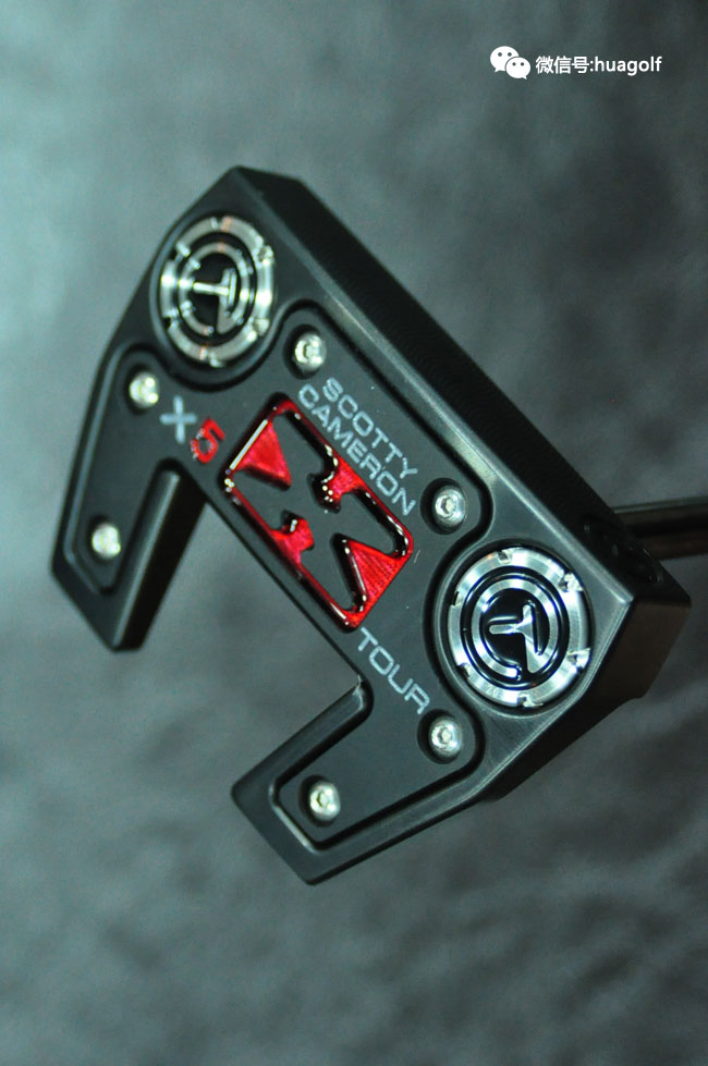 话说刚看见亚当-斯科特试用Scotty Cameron X5 tour,我们订的X5 Tour就到货了。与普通的X5不同,这款X5 Tour是全黑的,杆头底部的黑色片上的X标记有红色的外框,杆头的配重螺丝是当然是CT标志的,Scotty Cameron的3个小红点也是全部黑色的,连杆身也是全部黑色的,最后握把也是黑色的!全部黑色的搭配,加上杆头底部点缀的一块“娇艳欲滴”的红色搭配,实在是性感得不得了!