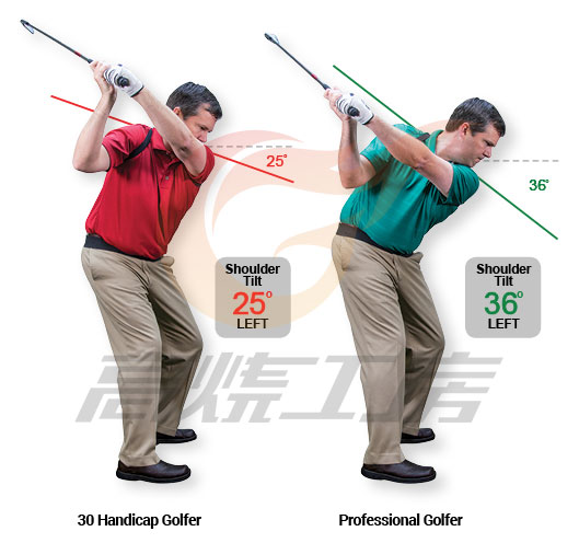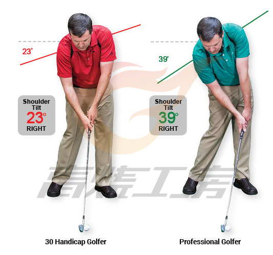 业余选手,23度倾斜;职业选手,39度倾斜。更多的胯部转动+重心有效转移,导致胯部向前移动,从而也带动肩膀角度变化。同时,这里还有一个决定是否“捞着打球”的差别,也就是击球瞬间手是否领先于球。对于铁杆来说这可能是至关重要的,会影响你的距离,扎实程度,倒旋,等等所有。