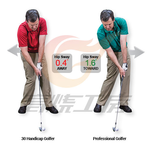 这张图表示上杆顶点,业余选手倾向于胯部右移,平均向右2.3英寸,而职业选手则相反,向左平均3.9英寸。
