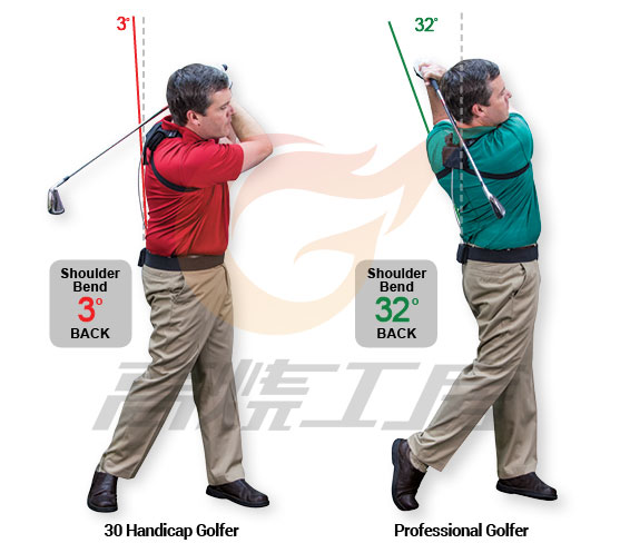 第一个是上杆顶点姿势,左边是差点30的选手平均数据,右边是职业选手平均数据(以下皆同)