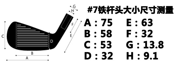 【杆头参数】 以下参数为#7铁,实测 重量:270.6克 杆面角:32度 Lie角:61.5度 杆面后移(FP):3.3mm(什么是FP?请点击:) 杆头尺寸: