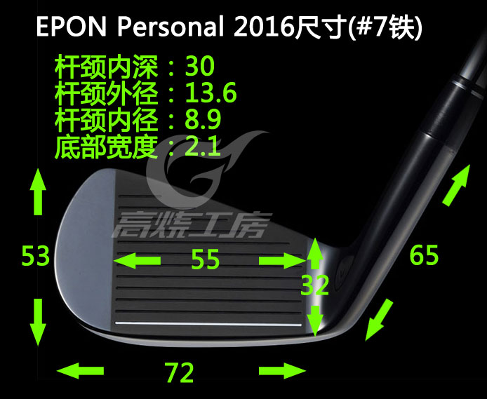 Personal当然还是采用EPON最常见的S20C软铁锻造,5铁角度为26,7铁角度34,P杆角度46。角度不强,比起现在越来越夸张的角度来说Personal还是保持了比较传统的角度安排。加之杆头重心比较靠后,是比较容易起球,弹道偏中高的杆头。
