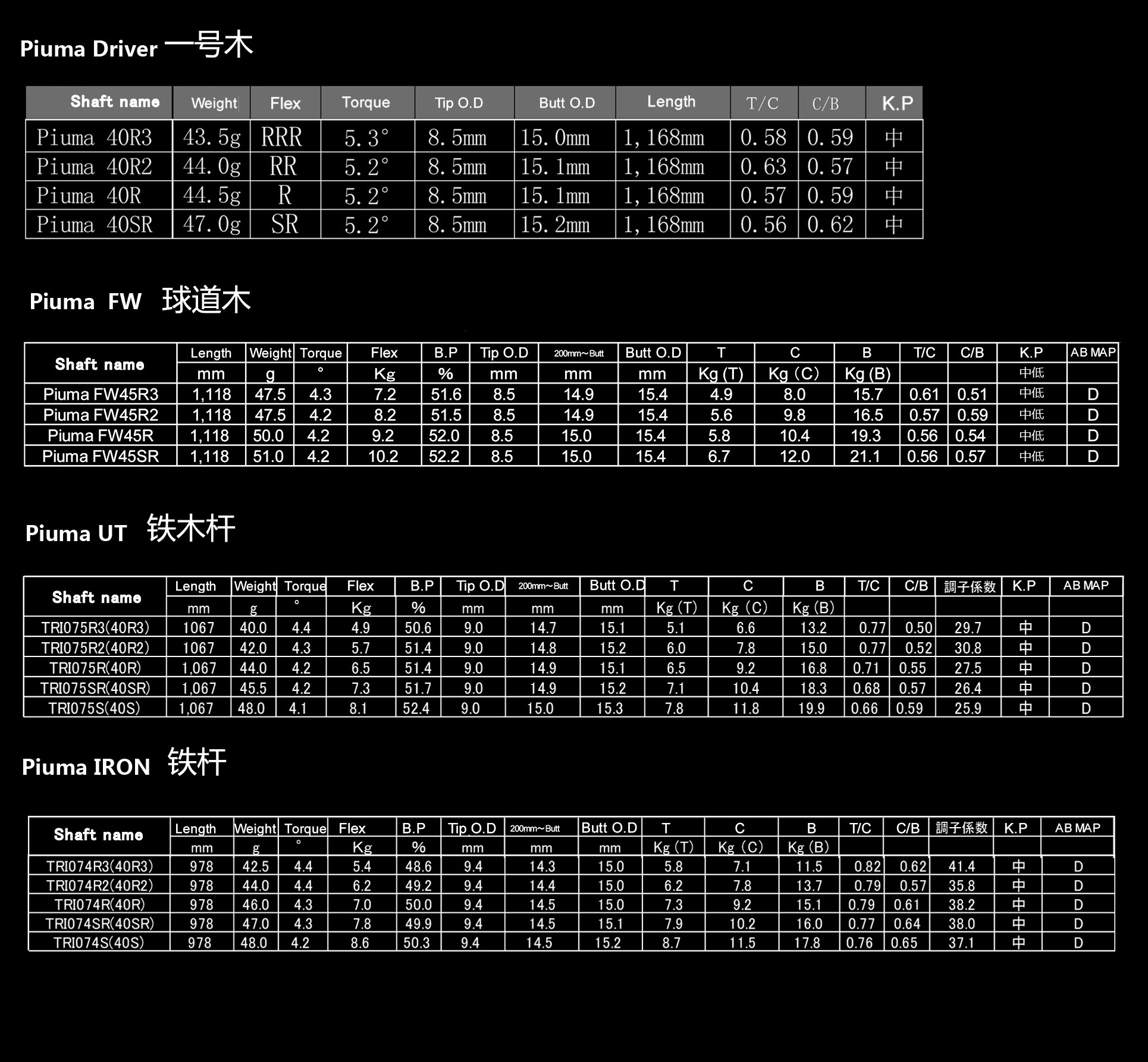 Basileus Piuma代表着羽毛的意思,是Basileus推出以来最轻量化的设计。在刚刚推出Piuma的时候,只有40克的R2,R,和SR的设计,如今不仅扩展了更软的R3,一号木里有提供50的设计,并且还新推出了球道木,铁木杆,铁杆整套的设计。
