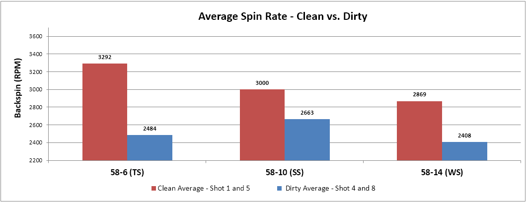 既然我们已经获得了击球的完整数据,我们不妨来对比一下第一(五)次击球与第四(八)次击球的“平均倒旋”。在第一(五)次击球时,杆面最为干净,而在第四(八)次击球时,杆面则没有那么干净。这三支挖起杆的倒旋的差别还是比较明显的,在杆面干净的状况下,球的倒旋平均要更大15%至20%。