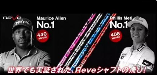 世界长打王 MAURICE(男)440码的距离和PHILLIS (女)406码的距离就是使用REVE杆身打出的。REVE品牌拥有一号木杆身两款、球道木杆身一款、小鸡腿杆身一款、铁杆一款、推杆一款。其中一号木是以不同的制作材料来区分出两款的型号。